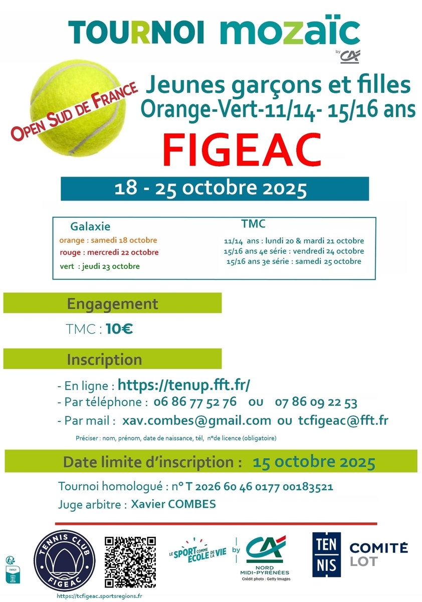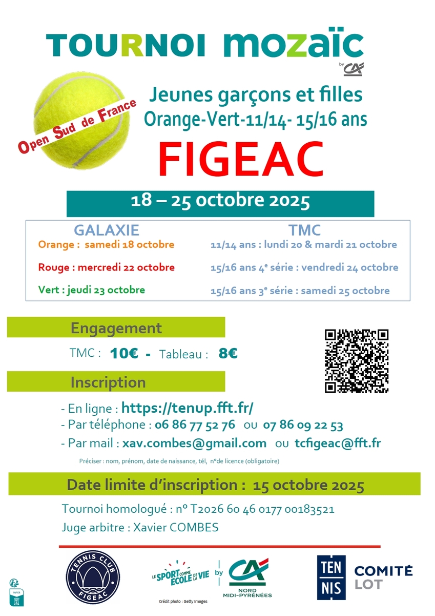 Le tournoi des jeunes appelé Tournoi Mozaïc aura lieu à Figeac du 18 au 25 octobre 2025. Nous n'avons pas de salle ; en cas de météo défavorable, les épreuves seront annulées.